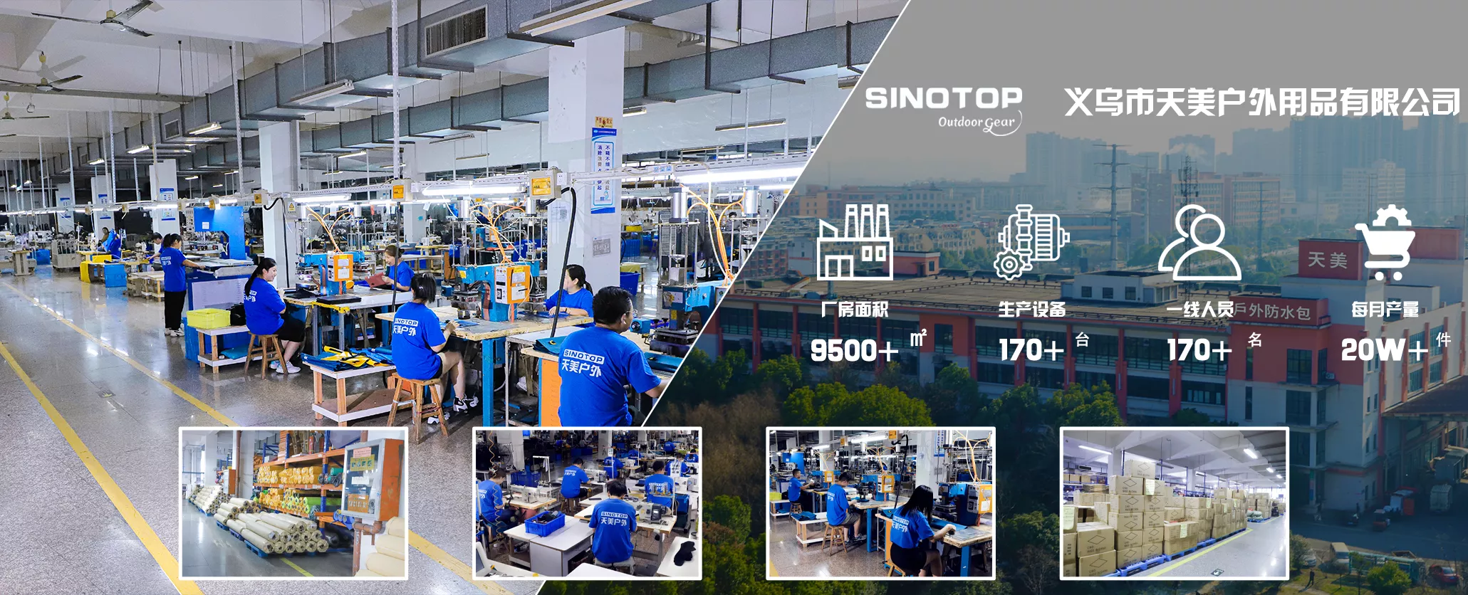 义乌市天美户外用品有限公司——创建于2009年,是一家集研发、生产、销售、服务于一体的工贸型生产企业。位于世界小商品之都、“一带一路”新丝路起点——浙江义乌;公司占地9500㎡,现有员工170余人,7条生产线,超过120台的机器设备,月生产能力约20万个。主要经营的产品有:防水桶包、防水背包(登山包)、防水挎包、防水旅行包、冰包、防水手提包、防水腰包、防水斜挎包、户外野营包、手机防水袋、防水车用包(摩托车、自行车、越野车)、防水枪套等。 公司建立了严格的质量管理体系,通过了ISO9001:2015质量管理体系认证,BSCI等认证。公司先后获得60多项国家专利,2018年起,一直被评为“国家高新技术企业”。本着“以品质赢口碑,以服务建桥梁”的经营理念,客户和经销商遍及70多个国家及地区。 公司创建了“SINOTOP”品牌,SINOTOP一直专注于追求防水包的品质、拓宽产品适用场景,希望更多的群体受惠于这类产品带来的便利。产品设计从客户体验、场景需求方面 精益求精,力求每一件产品都能给人带去实用、放心、舒适的体验。